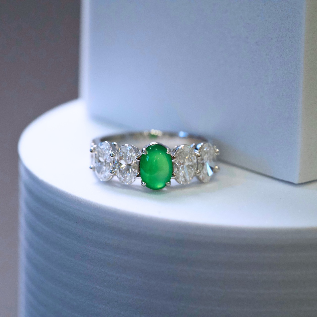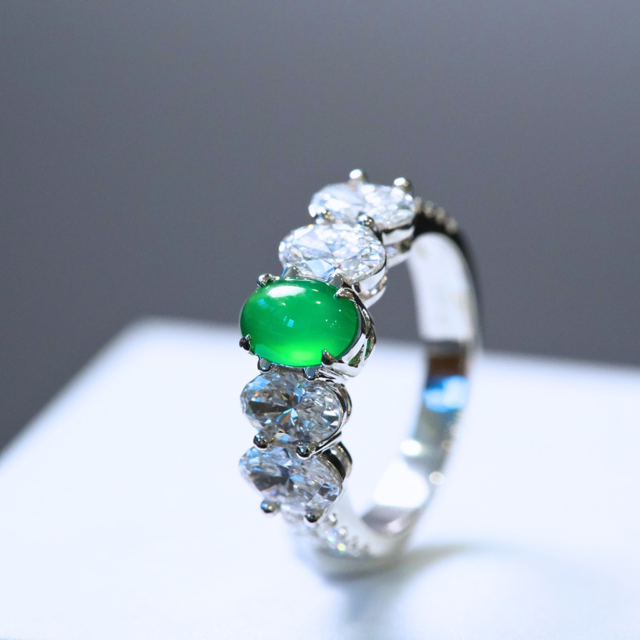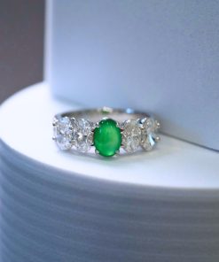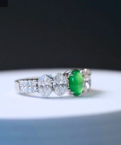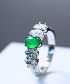 Nhẫn ngọc phỉ thúy viên chủ cao băng xanh lục dương khởi quang là thiết kế đỉnh cao dành cho giới sưu tầm trang sức cao cấp. Viên chủ sở hữu sắc xanh lục dương tươi sáng, độ băng cao, hiệu ứng khởi quang mạnh, bắt sáng rực rỡ dưới mọi góc nhìn, thể hiện trọn vẹn khí chất sang trọng và quyền quý.