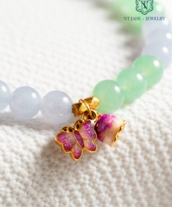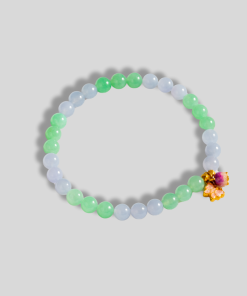 Điểm nhấn đặc biệt của sản phẩm chính là charm hoa linh lan vàng 24K, tỏa sáng rực rỡ trên nền ngọc tím – xanh. Sự kết hợp này mang đến một tổng thể vừa thanh thoát, vừa kiêu sa, khẳng định phong cách thời thượng và gu thẩm mỹ tinh tế của người sở hữu.